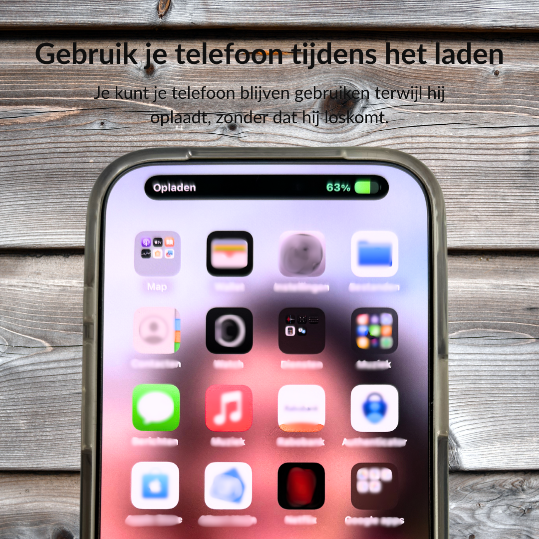 Ja, dankzij de sterke MagSafe-magneet blijft je telefoon stevig vastzitten, zelfs als je hem vasthoudt of beweegt tijdens het laden.